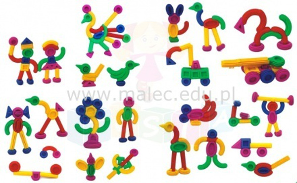 Gumowe klocki różnych kształtach i kolorach rozwiną fantazję i wyobraźnię dziecka, pozwolą zbudować różne postacie i pojazdy.