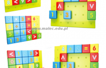 Zestaw zawiera też elementy do nauki liczenia: podstawa plus klocki z nadrukowanymi cyframi oraz znakami matematycznymi. Wymiary opakowania: 44,5 x 30,5 x 22,5 cm