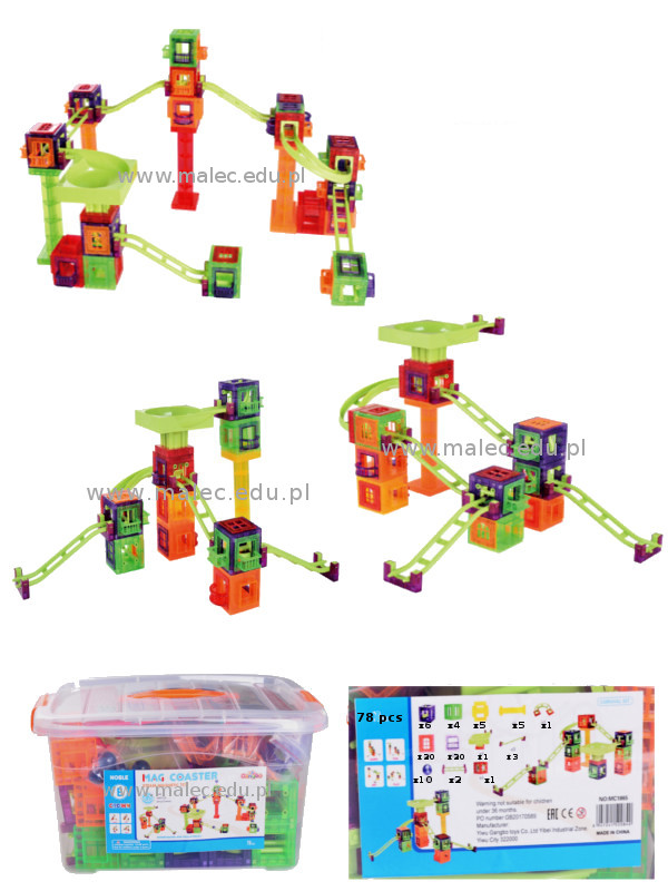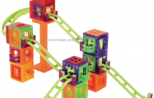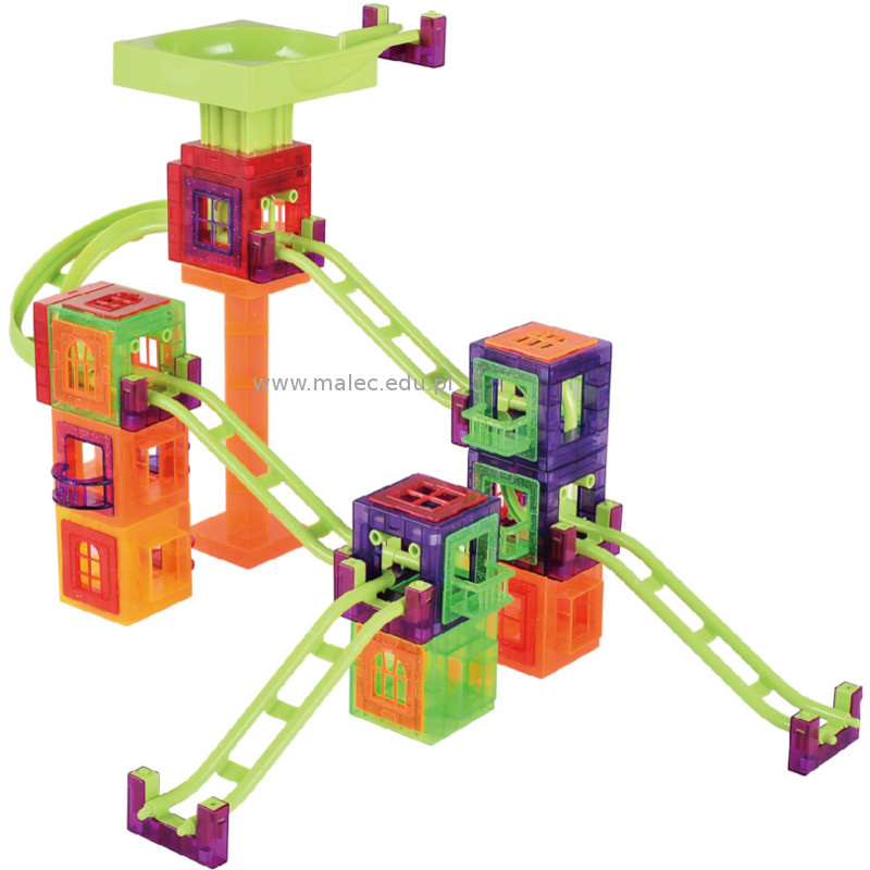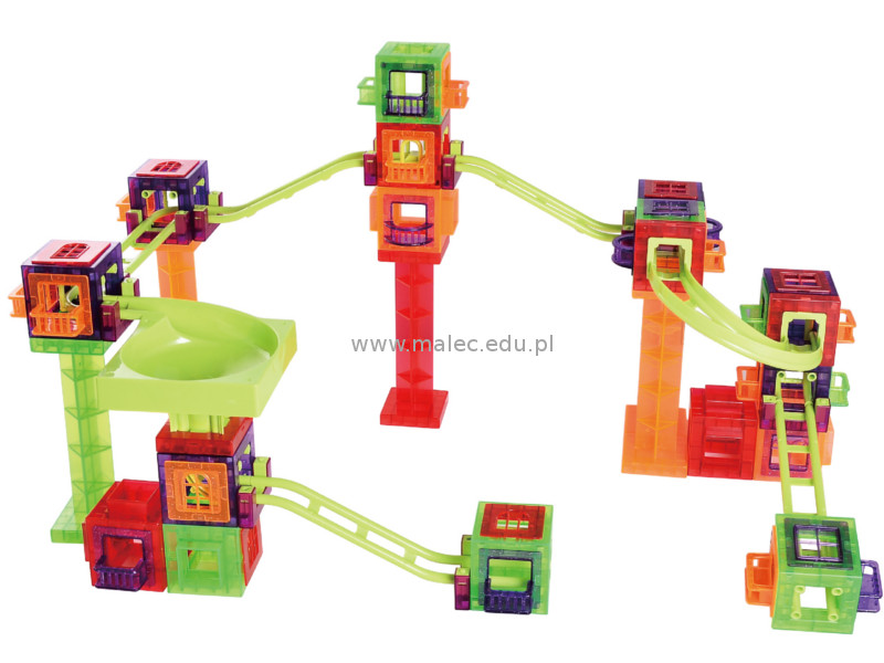 Zestaw magnetycznych klocków, z których można zbudować tor dla przezroczystej piłeczki.